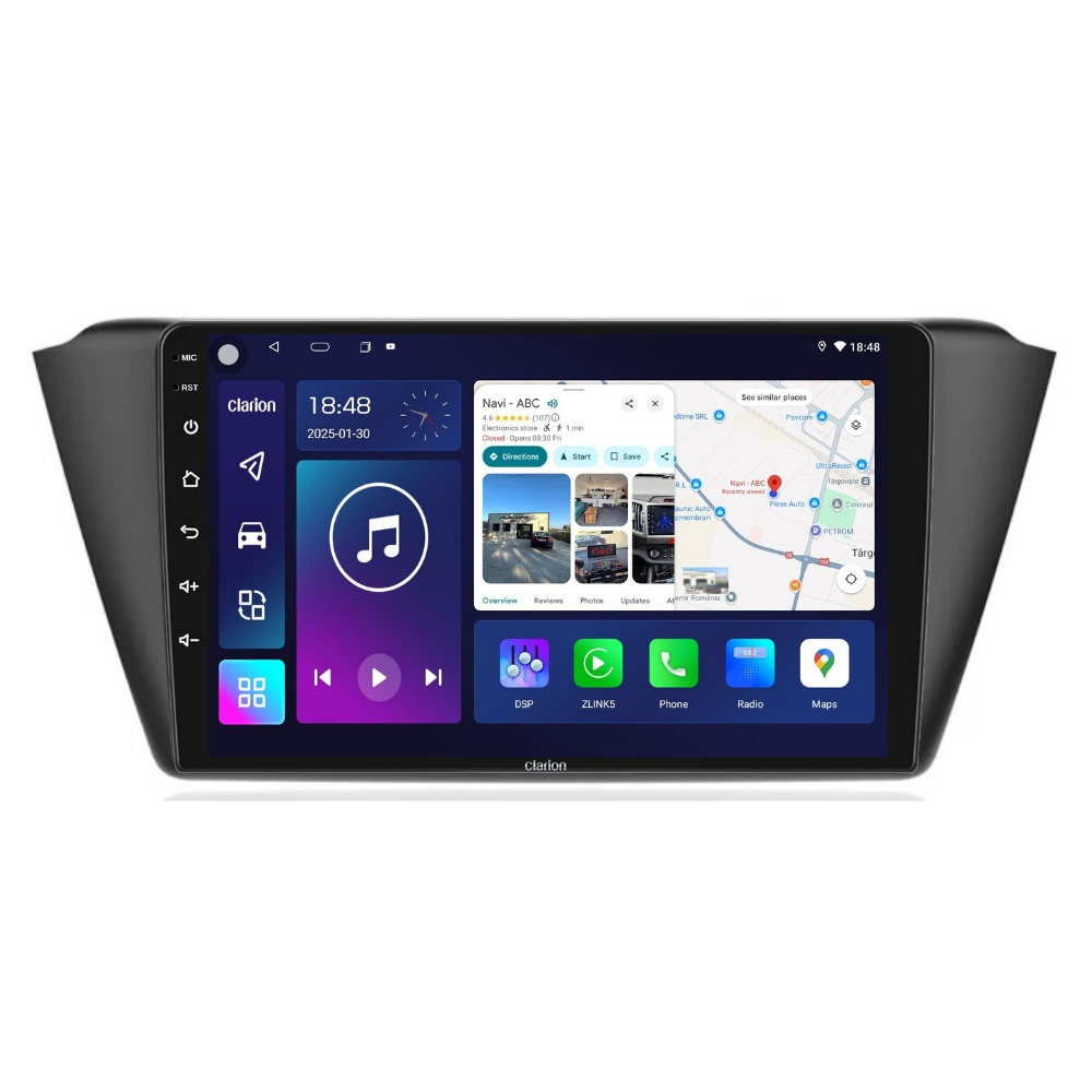 Navigație Auto Clarion cu Sistem Android Clarion , brand global renumit pentru inovațiile sale în tehnologia auto, cunoscut pentru furnizarea de soluții premium în domeniul navigației și infotainment-ului. Cu o experiență vastă de peste 85 de ani în industrie, Clarion este recunoscut pentru produsele sale de înaltă calitate si fiabilitate. Compania este un lider în dezvoltarea de echipamente auto care integrează tehnologia de ultimă oră. Unboxing Tableta – Detalii și Ce Conține Pachetul Mai jos găsești prezentarea tabletei Clarion, împreună cu toate accesoriile incluse în pachet. Instalare Plug & Play Se potrivește perfect în bord, fără a necesita modificări ale instalației electrice. Comenzile de pe volan rămân funcționale, iar sistemul se oprește automat la contact. Pachetul include rama si toate cablurile necesare montării pentru autoturismul dumneavoastra. Comenzi Volan Permite preluarea comenzilor originale de pe volan dar și adăugarea kit urilor de comenzi aftermarket în mașinile care nu au CarPlay & Android Auto Wirless Permite conectarea rapidă a telefonului pentru acces la aplicații esențiale precum navigație, muzică și apeluri, direct pe ecranul mașinii. Oferă o interfață optimizată, control vocal prin Siri sau Google Assistant și utilizare în siguranță fără a distrage atenția de la drum. Compatibilitate cu Camera Fata, Camera Trafic DVR & Camera de Marsarier Suportă cameră frontală pentru parcare, DVR pentru înregistrări video în trafic în timp real și cameră de marșarier pentru siguranță suplimentară la parcare. Procesor Puternic Octa Core Echipat cu un procesor performant, asigură o funcționare rapidă, multitasking fluid și o experiență fără întârzieri. Ecran IPS de Înaltă Calitate Dispune de un display IPS clar și luminos, cu rezoluție ridicată, oferind imagini vibrante și un răspuns tactil precis. Egalizator Auto & DSP Echipat cu egalizator auto și procesor de sunet DSP, permite ajustarea detaliată a sunetului pentru o experiență audio optimă în mașină. Conectivitate 4G LTE & Wi-Fi 2.4G HotSpot Asigură o conexiune stabilă, acoperire extinsă și eficiență optimizată pentru performanță constantă. Bluetooth, Hands-Free & AUX Permite conectarea telefonului prin Bluetooth pentru redare muzicală wireless și apeluri hands-free. Suportă și conexiune AUX pentru redare audio prin cablu. Navigație GPS Compatibil cu aplicații precum Waze, Google Maps și altele, oferă ghidare precisă în timp real și actualizări de trafic. Radio FM/AM cu RDS & Radio Online Suportă recepție FM/AM cu RDS pentru semnal stabil și sunet clar, afișând informații despre stațiile radio. Permite acces la posturi de radio Online. Ecran Împărțit si Multitasking Permite vizualizarea a două aplicații în paralel pe ecran, îmbunătățind multitasking-ul pentru a reda aplicațiile telefonului direct pe ecranul sistemului de navigație. Senzori de Parcare, Control Climă & Incalzire In Scaune Senzorii de parcare, incalzirea in scaune și controlul climatizării pot fi preluate direct pe navigație, dacă mașina suportă aceste funcții. Va multumim ca ati ales produsele