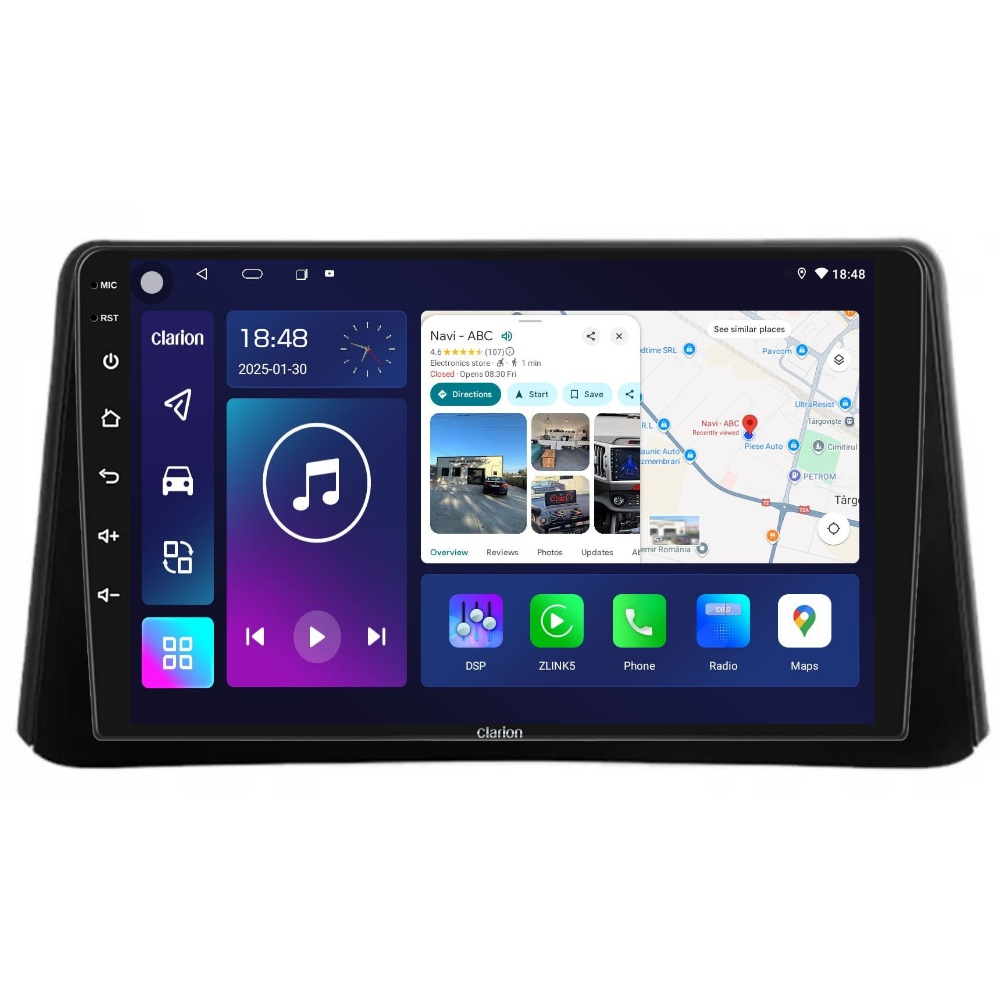 Navigație Auto Clarion cu Sistem Android Clarion , brand global renumit pentru inovațiile sale în tehnologia auto, cunoscut pentru furnizarea de soluții premium în domeniul navigației și infotainment-ului. Cu o experiență vastă de peste 85 de ani în industrie, Clarion este recunoscut pentru produsele sale de înaltă calitate si fiabilitate. Compania este un lider în dezvoltarea de echipamente auto care integrează tehnologia de ultimă oră. Unboxing Tableta – Detalii și Ce Conține Pachetul Mai jos găsești prezentarea tabletei Clarion, împreună cu toate accesoriile incluse în pachet. Instalare Plug & Play Se potrivește perfect în bord, fără a necesita modificări ale instalației electrice. Comenzile de pe volan rămân funcționale, iar sistemul se oprește automat la contact. Pachetul include rama si toate cablurile necesare montării pentru autoturismul dumneavoastra. Comenzi Volan Permite preluarea comenzilor originale de pe volan dar și adăugarea kit urilor de comenzi aftermarket în mașinile care nu au CarPlay & Android Auto Wirless Permite conectarea rapidă a telefonului pentru acces la aplicații esențiale precum navigație, muzică și apeluri, direct pe ecranul mașinii. Oferă o interfață optimizată, control vocal prin Siri sau Google Assistant și utilizare în siguranță fără a distrage atenția de la drum. Compatibilitate cu Camera Fata, Camera Trafic DVR & Camera de Marsarier Suportă cameră frontală pentru parcare, DVR pentru înregistrări video în trafic în timp real și cameră de marșarier pentru siguranță suplimentară la parcare. Procesor Puternic Octa Core Echipat cu un procesor performant, asigură o funcționare rapidă, multitasking fluid și o experiență fără întârzieri. Ecran IPS de Înaltă Calitate Dispune de un display IPS clar și luminos, cu rezoluție ridicată, oferind imagini vibrante și un răspuns tactil precis. Egalizator Auto & DSP Echipat cu egalizator auto și procesor de sunet DSP, permite ajustarea detaliată a sunetului pentru o experiență audio optimă în mașină. Conectivitate 4G LTE & Wi-Fi 2.4G HotSpot Asigură o conexiune stabilă, acoperire extinsă și eficiență optimizată pentru performanță constantă. Bluetooth, Hands-Free & AUX Permite conectarea telefonului prin Bluetooth pentru redare muzicală wireless și apeluri hands-free. Suportă și conexiune AUX pentru redare audio prin cablu. Navigație GPS Compatibil cu aplicații precum Waze, Google Maps și altele, oferă ghidare precisă în timp real și actualizări de trafic. Radio FM/AM cu RDS & Radio Online Suportă recepție FM/AM cu RDS pentru semnal stabil și sunet clar, afișând informații despre stațiile radio. Permite acces la posturi de radio Online. Ecran Împărțit si Multitasking Permite vizualizarea a două aplicații în paralel pe ecran, îmbunătățind multitasking-ul pentru a reda aplicațiile telefonului direct pe ecranul sistemului de navigație. Senzori de Parcare, Control Climă & Incalzire In Scaune Senzorii de parcare, incalzirea in scaune și controlul climatizării pot fi preluate direct pe navigație, dacă mașina suportă aceste funcții. Va multumim ca ati ales produsele